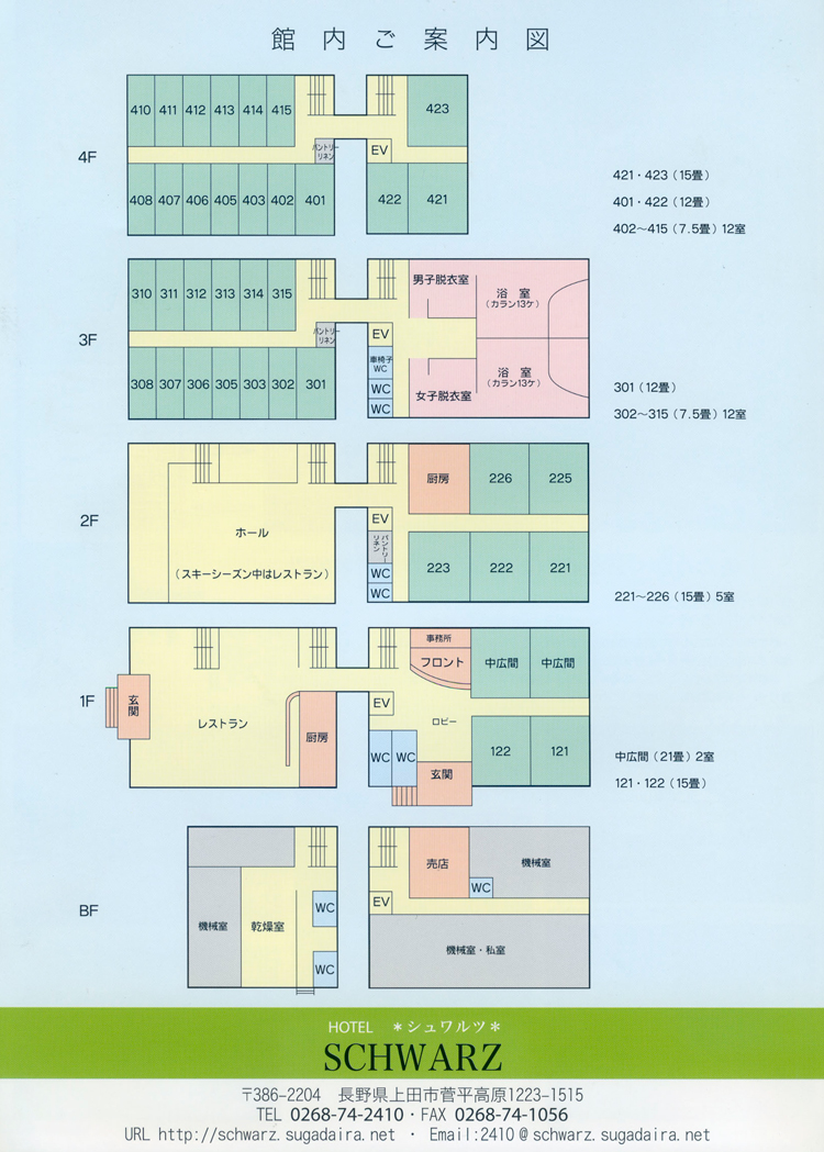 ホテルシュワルツは、菅平高原スキー場、白金シュワルツゲレンデ(スノーマシン完備)の真下に位置し、ゲレンデまで徒歩0分。合宿やスキー修学旅行などの団体宿泊に最適です。防火設備は、全館に火災報知器と非常用放送設備を設置し、消防署より「防火基準点検済証」を受けています。
